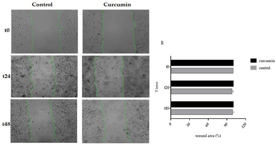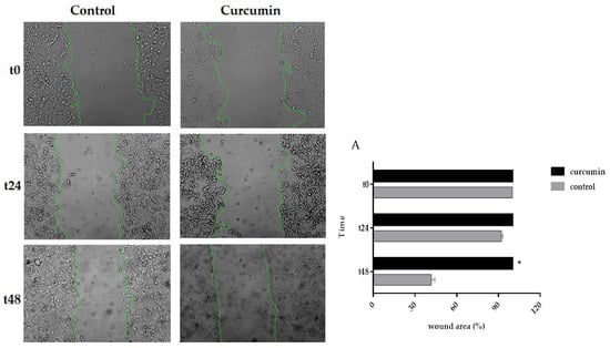The effect of curcumin on migration was assessed by the wound healing assay. After the cells became 90% confluent, 5 µg/mL of mitomycin was added for 2 h to prevent proliferation. Then, the cells were scratched with a sterile 100 µL pipette tip, washed twice with PBS to remove debris, and finally, fresh media along with curcumin was added. Images of the wound gap were taken using an inverted microscope at 0, 24, and 48 h following scratching. All experiments were carried out in triplicate. “Measurement length” in ImageJ software was used to measure the distance between the wound edges.