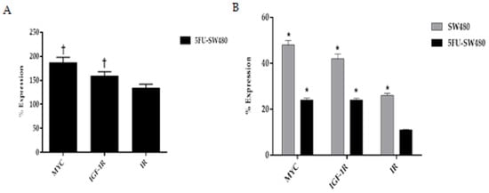 Real-time PCR of MYC, IGF-1R, and IR gene expression in the SW480 and 5FU-SW480 cells. (A) Basal expression of genes in the 5FU-SW480 cells compared to the SW480 cells. (B) Comparing the effect of 48 h treatment with 20 μM curcumin on the expression of all three genes in the 5FU-SW480 and SW480 cells. All values are presented as the mean ± SE of three independent experiments in triplicate. †, * denotes a statistically significant difference (p < 0.05) when compared to the SW480 and control cells, respectively.
