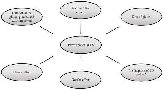 NCGS is defined as “a syndrome characterized by intestinal and extra-intestinal symptoms related to the ingestion of gluten-containing food, in subjects that are not affected by either celiac disease or wheat allergy” [5]. Although the real prevalence of NCGS remains unknown, current data suggest that it ranges from 0.6% to 6% in the general population [25,26,27,28,29]. One of the major challenges in the diagnosis of NCGS is the identification of the components that trigger the manifestations reported [9,30]. This is an area that remains poorly understood and has been the object of extensive research. Certainly, there are different components that may cause adverse reactions in NCGS patients, such as gluten, FODMAPs (fermentable oligo-, di-, monosaccharides, and polyols) and ATIs (amylase and trypsin inhibitors) [31]. According to some authors, NCGS individuals are sensitive to one or another, if not all, of these wheat components [32,33]. Furthermore, there is a huge spectrum of both gastrointestinal and extraintestinal manifestations [34]. In line with this, it is suggested that the pathogenesis of NCGS should be drawn taking into account the collective effect of the wheat components [35]. In this case, the gluten vehicle and placebo utilized for carrying out DBPC gluten challenges for identifying NCGS cases should include standardized amounts of the main suspected triggers of the condition.