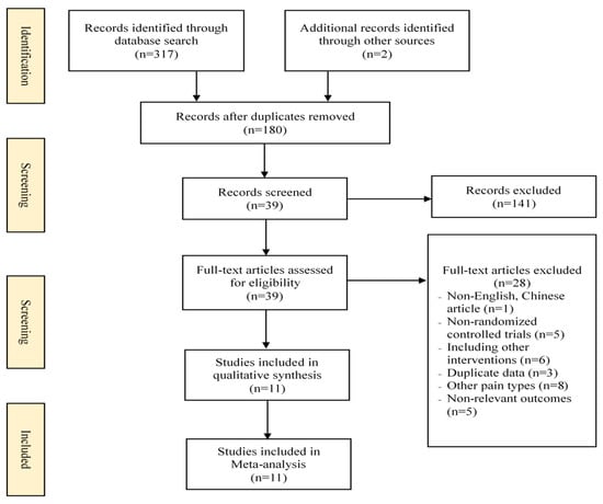 A total of 319 citations were initially identified from the electronic database (Figure 1). Thirty-nine potential studies were retained after screening the titles and abstracts and removing the duplicate publications (n = 139). Furthermore, 39 relevant studies were evaluated through reading full-texts, and 11 RCT studies [,,,,,,,,,,] were included in this meta-analysis.