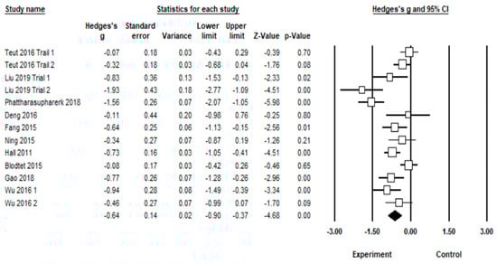 Additionally, moderator analyses and meta-regression were conducted from categorical and continuous predictors. The categorical predictor consisted of: (1) the baseline pain intensity of participants, where the pain intensity was coded as 1–38 mm, 39–57 mm, and 58–100 mm, representing mild pain, moderate pain, and severe pain, respectively []; and (2) the characteristics of the control group and experimental group, where the control groups were categorized as active interventions or passive interventions, and the mode of experimental intervention was classified as Tai Chi exercise or Qigong exercise. The coding of the exercise session time was defined as ≤45 min and >45 min. The duration of exercise was coded as short (≤ 12 weeks) or medium (13–26 weeks). The weekly frequency was coded as low (≤2), medium (3–4), or large (≥5). The continuous predictors included the mean age of the subjects and the total time of TCE exercise. All analyses were conducted using the Comprehensive Meta-Analysis Software.