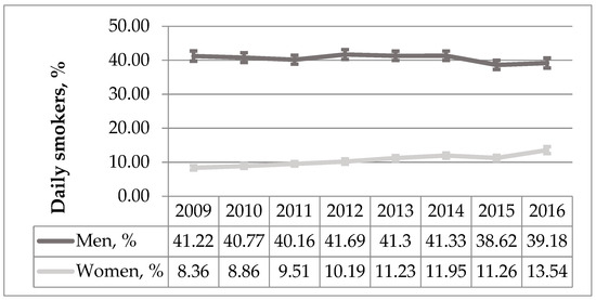 The percentage of daily smokers in gender groups during 2009–2016 period (%, 95% CI).