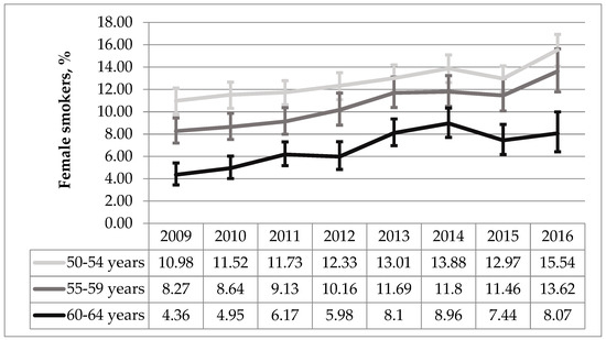 Smoking prevalence among females was the highest in the group aged 50–54 and the number of daily smokers in this group significantly increased during the 2009–2016 period (AAPC 4.96%, p < 0.001). The same statistically significant upward trend was found among females aged 55–59 (AAPC 7.13%, p < 0.001) and 60–64 years (AAPC 8.80%, p < 0.001) (Figure 2).