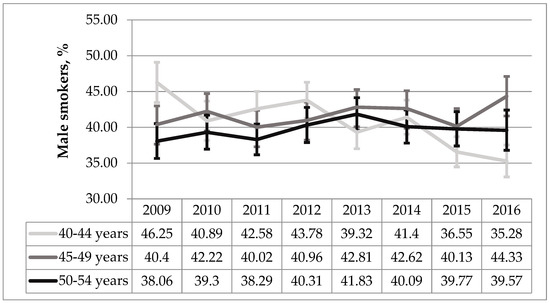 Smoking prevalence in a male group aged 40–44 significantly decreased (AAPC −3.87%, p < 0.001) while there was no significant change in another two male groups aged 45–49 and 50–54 years (p = 0.139 and p = 0.166 respectively) (Figure 3).