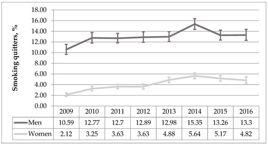 The trend analysis of smoking cessation activity among men and women during 2009–2016 period (%, 95% CI).