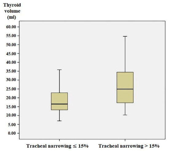 According to the correlation analysis, there was a significant negative correlation between TV and TCR (p < 0.001; r = −0.324). In addition, a significant positive correlation was detected between TV and age (p < 0.001; r = 0.330). When the study population was divided into two subgroups according to tracheal narrowing of less than 15% and more than 15%, the subgroups consisted of 103 and 60 patients, respectively. The mean TV in patients with tracheal narrowing less than 15% and more than 15% were 19.77 ± 10.40 mL and 40.08 ± 47.46 mL, respectively. This difference was statistically significant (p < 0.001) (Table 2, Figure 3).