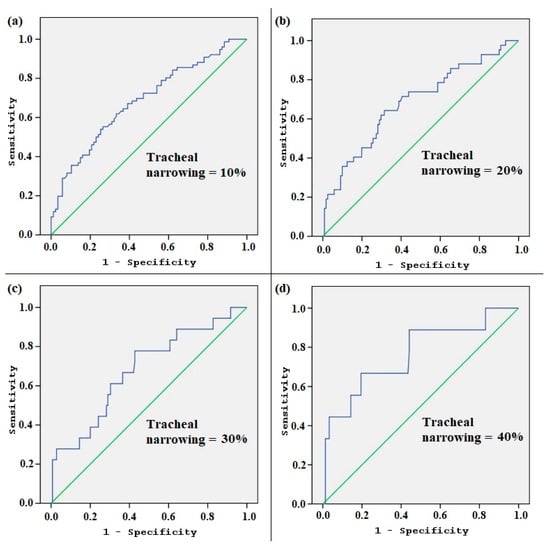 The receiver operating characteristic (ROC) curve analysis according to the different levels of tracheal narrowing. The graphics (a), (b), (c), and (d) show how the area under the curve (AUC) changes as the tracheal narrowing is adapted to 10%, 20%, 30%, and 40%, respectively.