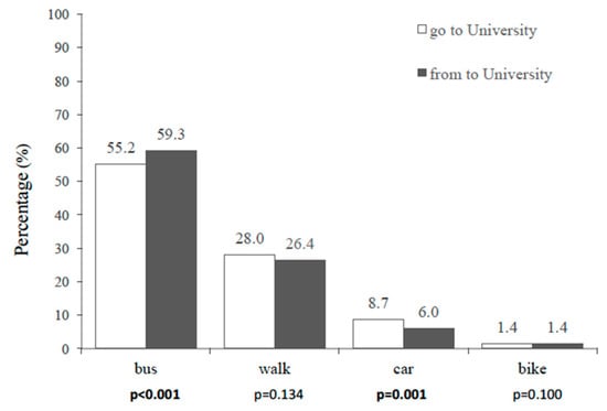 The percentage of the usual mode of commuting to and from university is shown in Figure 1. The main mode of commuting was by bus, where the percentage was lower in the commuting to university than from university (55.2% vs. 59.3%; p < 0.001). The second most used mode of commuting was walking, without statistical differences between both directions (28.0% vs. 26.4%; p = 0.134). The third mode of commuting most used was by car, which presented higher values of commuting to university than from university (8.7% vs. 6.0%; p = 0.001). Commuting by bike was the least used mode and presented the same percentages in both directions (1.4%).