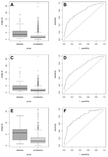 Table 2 shows HOMA-IR cut-offs maximizing the sum of the sensitivity and specificity for T2DM in the sample. The HOMA-IR cut-off separating nondiabetics (NGT and prediabetics) and diabetics based on their IR in the entire sample, regardless of sex, was 3.63. If a patient’s HOMA-IR score is greater than 3.63, then regardless of his/her sex, he/she has a significantly higher chance of having T2DM. The same value, with a slightly smaller sum of sensitivity and specificity, was calculated for females alone. In males, the HOMA-IR cut-off was 3.69; they had the highest sum of sensitivity and specificity. Figure 1A,C,E show, in the form of boxplots, the association between HOMA-IR scores and T2DM diagnosis in both sexes, females and males, respectively. The similarity of the characteristics, including box shifts in the boxplots, suggests the existence of a constant relationship between HOMA-IR scores and the presence of T2DM. Figure 1B,D,F show ROC curves for HOMA-IR scores in both sexes, females and males, respectively. The adequate upper half-plane convexity of the curves suggests that the predictive ability of HOMA-IR in diagnosing T2DM is not negligible. The area under the ROC curve was 0.7291 (95% confidence interval (CI) 0.7272-0.7310) for T2DM diagnosing using the cut-offs in both sexes, 0.7075 (95% CI 0.7055–0.7096) in females, and 0.7382 (95% CI 0.7381–0.7383) in males. The HOMA-IR cut-off distinguishing subjects with NGT and prediabetics was 1.82 (sensitivity 0.60, specificity 0.66). The HOMA-IR cut-off separating prediabetics and diabetics had the same value as in case of all nondiabetics and diabetics (3.63) with very similar sensitivity (0.56) and slightly lower specificity (0.78).
