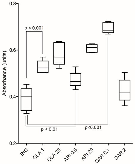 The two-way ANOVA analysis showed a significant influence caused by the treatment (F (3, 32) = 40.98; p < 0.0001) and the interaction (F (3, 32) = 47.70; p < 0.0001), but not the dose applied (F (1, 32) = 2.293; p = 0.1398). The Dunnett’s multiple comparisons test showed that the TG content of adipocytes was increased significantly by both concentrations of OLA (p < 0.001 for both) and ARI (p < 0.01 and p < 0.001 for the lower and higher concentrations, respectively), as well as by the lower concentration of CAR (p < 0.001), compared with the IND group. The 0.1 µM concentration of CAR robustly increased TG accumulation, giving the highest values, whereas the higher concentration of the drug produced a value similar to that of the IND group (p > 0.05), the lowest of all treated groups.