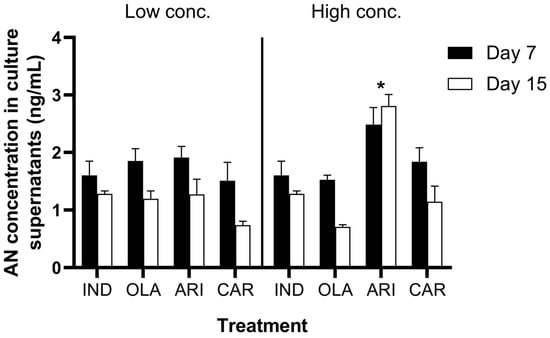 AN concentrations in the cell culture supernatants after 7 and 15 days of treatment. *Significant changes compared with IND (p < 0.05). IND: cell lines induced with DMEM, IBMX, insulin (INS), and pioglitazone (PIO). OLA: cell lines exposed to 1 or 20 µM olanzapine. ARI: cell lines exposed to 0.5 or 20 µM aripiprazole. CAR: cell lines exposed to 0.1, 2 µM cariprazine. Data are expressed as means ± standard error of mean, and the level of significance was set to α = 0.05.