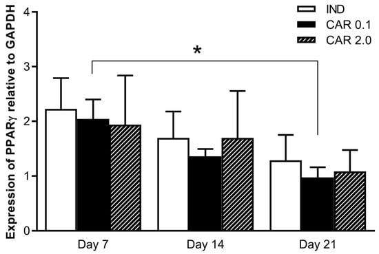 Expression of PPAR-γ in cell cultures after CAR exposure. IND (7, 14, 21): cell lines receiving induction solution (DMEM, IBMX, insulin (INS), and pioglitazone (PIO) for 7, 14, and 21 days, respectively. CAR 0.1, 2 (7, 14, 21): cell lines exposed to 0.1 or 2 µM cariprazine after 7, 14, and 21 days, respectively. Significant changes are noted with * (p < 0.05). Data are expressed as means ± standard error of mean, and the level of significance was set to α = 0.05.