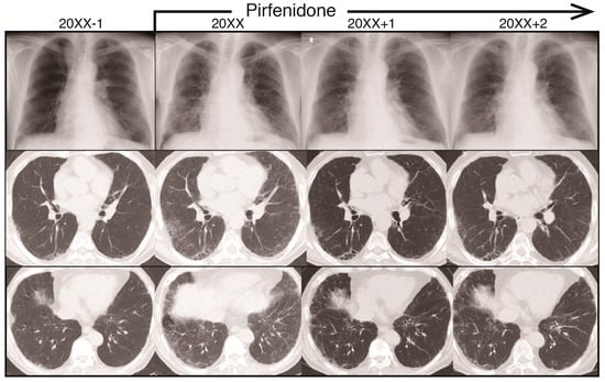 Radiograph images during the clinical course of idiopathic pulmonary fibrosis (IPF) for one year before the two years after initiation of pirfenidone treatment. Upper panel: reticular shadow on chest radiograph. Middle and lower panels: computed tomography (CT) images of influence of pirfenidone on IPF over a two-year period.