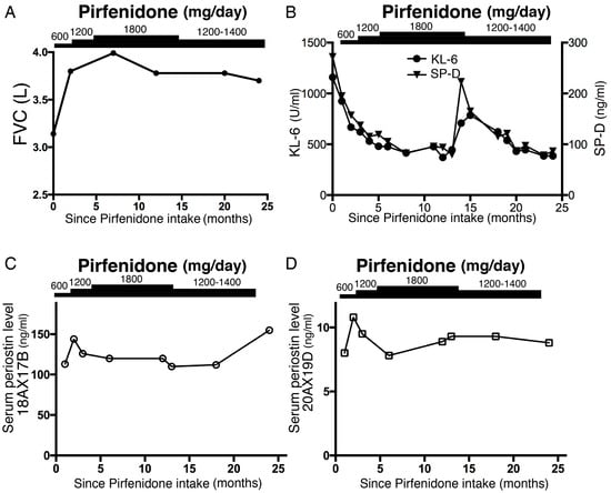 Time course of (A) forced vital capacity (FVC), (B) serum fibrotic marker KL-6 and SP-D levels, and (C,D) serum periostin levels after administration of pirfenidone. After pirfenidone treatment, (A) FVC was improved, and (B) KL-6 and SP-D levels were normalized. Periostin levels were not clearly elevated on initial admission and were not affected by pirfenidone (C,D). Antibodies 18A X 17B (<95 ng/mL) and 20A X 19D (<13.4 ng/mL) recognize total (inflammatory and fibrotic) and monomeric (fibrotic) periostin, respectively [].