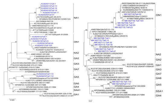 - Almajhdi, F.N.; Farrag, M.A.; Amer, H.M. Genetic diversity in the G protein gene of group A human respiratory syncytial viruses circulating in Riyadh, Saudi Arabia. Arch. Virol. 2014, 159, 73–81. [Google Scholar] [CrossRef] [PubMed]