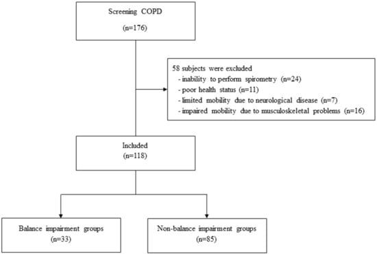 The BBS was performed after the patients completed the questionnaire and lung function test. The BBS is a 14-item scale for assessment of functional activities in daily life tasks and is considered the gold standard test for static and dynamic balance abilities []. These activities are classified from 0 (unable) to 4 (independent). The sum of these points can reach a maximum of 56 points, and less points indicate a greater danger to the individual’s stability. A cut-off score of <46 of BBS can be successfully used to identify those who are at risk of falling [,]. The TUG test is a test of general mobility []. An armchair of standard height was used and a well-seen marking tape was placed 3 m away on the floor. The starting position was sitting with the patient’s back and hands resting on the back and arms of the chair, respectively. The participants were asked to stand up and walk toward the marker before crossing it, then return to their seats again. All subjects were instructed to perform the TUG test at their regular speed. The timing of the TUG started when the participant’s back came off from the back of the chair, and stopped when their buttocks and backs touched the seats and backs of the chair again, respectively. The TUG test was performed three times with a pause between repetitions with the shortest time being selected. The previous study suggested that TUG time ≥ 13.5 s was classified as balance impairment []. Due to acceptable sensitivity (91% and 80%) and specificity (82% and 100%) for the Berg Balance Scale and the TUG test for predicting risk of falling [,], a combined cut-off score of BBS < 46 and/or the TUG of ≥ 13.5 s was defined as balance impairment in our study.