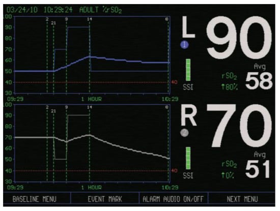 Figure 2). Sensors were connected to the INVOS monitor. The initial values on the screen were set as baseline rScO2 values. The patient is breathing room air before induction of anesthesia. By establishing baseline rScO2 values, INVOS further tracks the changes in rScO2 values for the left side and for the right side (