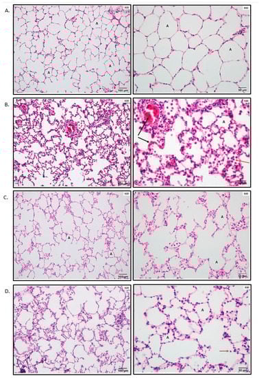 For histological evaluation, lung tissues were dissected, fixed in 10% neutral formalin, embedded in paraffin wax, and then cut into 5-µm-thick sections. The sections were placed on slides, then deparaffinized in xylene, and rehydrated in graded alcohol. Slides were stained with hematoxylin and eosin (H&E) for basic histological evaluation and for detecting the general tissue morphology using standard protocols. The slides were examined and photographed under a light microscope (Olympus BX61, Tokyo, Japan). Two independent histologists assessed and scored the tissue injuries in a blinded fashion according to a scoring system modified from Kandilci et al. [] and Pirat et al. []. The scoring was graded as follows: score “0 (null)” indicates 0% involvement, score “1” indicates 1–25% involvement, score “2” indicates 26–50% involvement, score “3” indicates 51–75% involvement, and score “4” indicates 75–100% involvement. Five parameters (interstitial edema/infiltration, intra-alveolar edema/infiltration, intra-alveolar hemorrhage, capillary congestion, and airway epithelial cell damage) were evaluated for lung injury, and the total lung injury score was calculated.