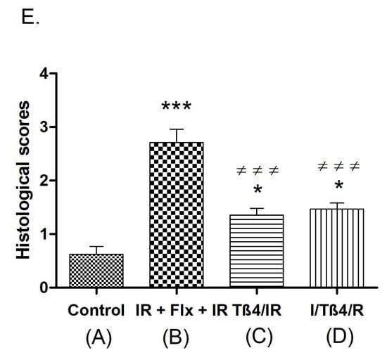 Photomicrographs of lung samples and histological scoring of lung tissue. * p < 0.05, *** p < 0.001 vs. control; ≠≠≠ p < 0.001 vs. ischemia–reperfusion (IR). (A) Lung samples of the control group were stained with hematoxylin and eosin (H&E). The control group shows minimal negligible histological alterations in lung tissue. The alveolar walls are very thin, and the majority of the alveoli contain no cells; A: alveolus. (B) Representative photomicrographs of lung samples of the IR group stained with hematoxylin and eosin. The IR group shows moderate lung ischemia–reperfusion injury with marked blood vessel congestion (black arrow) and leukocytic infiltration of the alveolar lumen (red arrow); A: alveolus. (C) Representative photomicrographs of lung samples of thymosin beta 4 (Tβ4)/IR stained with hematoxylin and eosin. The image demonstrates the improvement of the lung histopathology regarding the lung ischemia–reperfusion injury. (D) Representative photomicrographs of lung samples of I/Tβ4/R stained with hematoxylin and eosin. The I/Tβ4/R group, similar to the Tβ4/IR group, has less damage than the IR group; red arrow: infiltrative cells in the lumen of the alveoli. (E) Histological scoring of lung tissue.