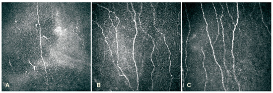 The corneal nerves analysis was performed using automated Corneal Nerve Fibre Analyser ACCMetrics V.2. The software automatically extracts and quantifies nerve fibre metrics in images obtained using the Heidelberg HRT III corneal confocal microscope with 384 × 384 pixels and the field of view of 400 × 400 μm2 (resolution: 400/384 = 1.0417 μm). It quantifies the corneal nerve fibre length (CNFL)—the total length of nerves mm/mm2, nerve fibre density (CNFD)—the number of fibres/mm2, nerve branch density (CNBD)—the number of branch points on the main fibres/mm2, and nerve fibre total branch density (CTBD)—the total number of branch points/mm2 [14,15,16,17,18,19,20].