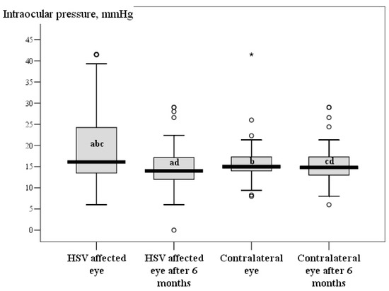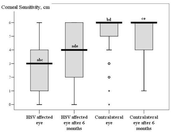 After six months, all of the examinations were performed again on patients with herpetic eye disease and compared with the primary examination data. During the follow up, corneal sensitivity increased in HSV affected eyes but did not reach the contralateral eye or herpes labialis and healthy controls (p < 0.05) Changes in corneal sensitivity and intraocular pressure are demonstrated in Figure 2 and Figure 3. All of the corneal sub-basal nerve parameters increased during the follow up in HSV affected patients, but only CNFD and CNBD were statistically significant in HSV affected eyes (p < 0.05). However, the parameters of HSV-affected eyes did not reach the parameters of contralateral eyes and of the herpes labialis and healthy control groups (p < 0.05). Further parameters of contralateral eyes did not reach those of herpes labialis or the healthy controls’ eyes (p < 0.05). Data of sub-basal nerve parameter changes are presented in Table 4.