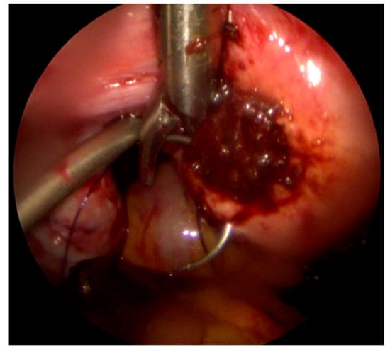 Active arterial bleeding from a rupture of interstitial pregnancy was found in the area of the left uterine horn, at the site of a previous salpingectomy. Coagulation was performed and hemostatic suture was placed (Figure 1).