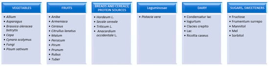 FODMAPs are short-chain sugars with less than 10 carbon atoms in the molecule []. The attention of scientists in recent years was drawn to the potential contribution of FODMAPS to pathogenesis of gastrointestinal disorders []. The scientists from Monash University in Australia conducted thorough analysis of a group of carbohydrates, which, despite their different structures, produced similar postprandial effects. The most prevalent forms of FODMAP include: fructooligosaccharides (FOS), galactooligosaccharides (GOS), lactose, fructose, polyols, sorbitol and mannitol. Barrett et al. created a list of food products that are good sources of FODMAP (Figure 1) and poor in short chain sugars (Figure 2) [].