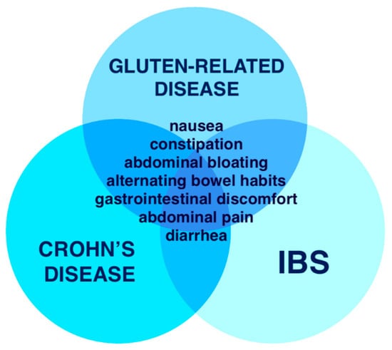The fact that numerous symptoms manifested by active NCGS can be either vague or simply mimic other medical conditions, makes the diagnostic process long lasting and complex. For instance, bloating, abdominal pain, and irregular bowel movements are typical symptoms seen in IBS []. The overlapping symptoms of IBS, Crohn’s disease and GRD are shown in Figure 3.