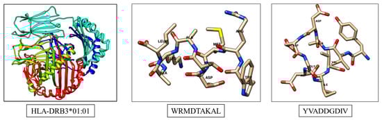 Molecular docking complexes for two predicted peptide structures with MHC II allele HLA-DRB3*01:01 protein are shown in Figure 3. The estimated accuracy of docked structure for peptide YVADDGDIV is higher than that of WRMDTAKAL, as shown in Table 8.