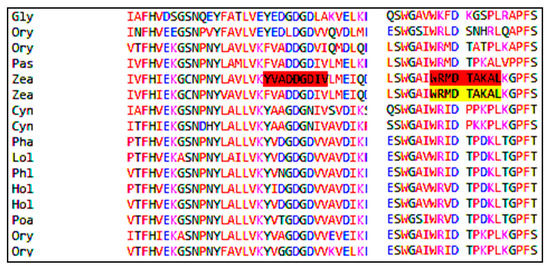 Among these 50 allergens, 14 grass allergens are selected, omitting isoallergenic proteins. The multiple alignment sequence study for these two T cell epitopes such as YVADDGDIV and WRMDTAKAL in 14 grass allergens, is shown in Figure 4. This study shows that the locations of amino acids present in these epitopes are almost conserved, so these two epitopes may be effective for all these 14 grass allergens after clinical verification.