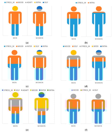 Stepwise multiple linear regression model by sex. (a) Harassment–social acceptance; (b) Overload; (c) Irritability–tension–fatigue; (d) Energy–joy; (e) Fear–anxiety; (f) Self-realization–satisfaction.