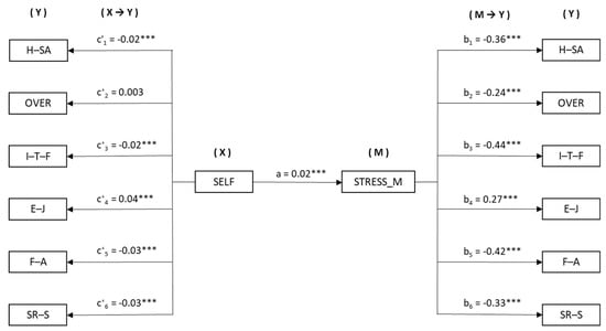 The results of the estimation of the direct effects, X→Y, demonstrate the significance of self-efficacy on: H–SA (B = −0.02 p < 0.001), I–T–F (B = −0.02 p < 0.001), E–J (B = 0.04 p < 0.001), F–A (B = −0.03 p < 0.001), and SR–S (B = −0.03 p < 0.001), but not on OVER, which was not significant (B = 0.003 p = 0.241). Furthermore, the M→Y effects estimated showed a significant effect of stress management (M) on all the perceived stress components: H–SA (B = −0.36 p < 0.001), OVER (B = −0.24 p < 0.001), I–T–F (B = −0.44 p < 0.001), E–J (B = 0.27 p < 0.001), F–A (B = −0.42 p < 0.001), y SR–S (B = −0.33 p < 0.001).