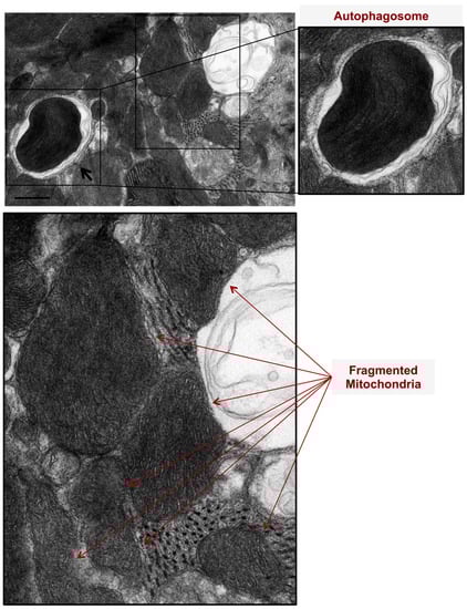 Mitochondrial autophagy (mitophagy) and mitochondrial fragmentation are pathological features evident in phenylephrine-stressed cardiac myocytes, in vitro. Cardiac myocytes were stressed with 10 μM Phenylephrine for 2 h. Note the presence of autophagosomes, double membranes, and surrounding damaged and fragmented mitochondria (black arrows). Also, note the presence of fragmented mitochondria (red arrows). Photomicrograph is 40k × magnified, scale bar 0.5 μm.