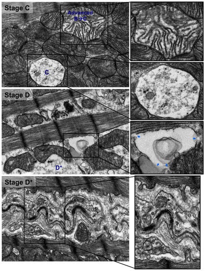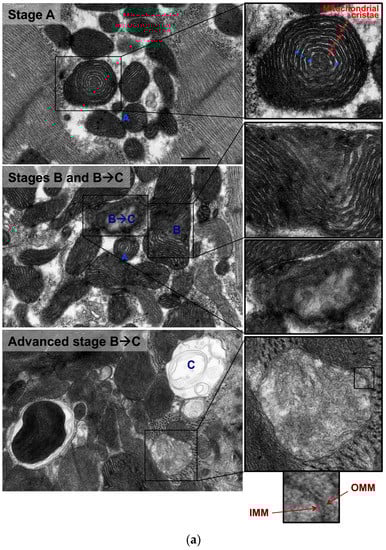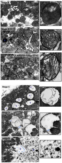 Also, there were mitochondria at different stages of vacuolar degeneration. The early stages of mitochondrial vacuolar degeneration are defined as stage A, sage B, and early stage B→C. In stage A, mitochondrial cristae become concentrically arranged in an onion-like pattern, red dots in Figure 2 stage A-zoomed photomicrograph, with widened space between them, blue bars in Figure 2 stage A-zoomed photomicrograph. These early conformational changes in mitochondrial cristae morphology and the widened space between them signal early loss in mitochondrial cristae and probably early mitochondrial dysfunction. The second stage of mitochondrial vacuolar degeneration, stage B, is defined as a focal loss and dissolution of mitochondrial cristae in one mitochondrion area. The third stage is a transition stage between stages B and C and is defined as stage B→C, where there is multifocal loss and dissolution of mitochondrial cristae per mitochondrion, Figure 2 Stages B and B→C. In the advanced stages of mitochondrial vacuolar degeneration there is evidence of mitochondrial swelling. These advanced stages are defined as advanced stage B→C, stage C, and stages D and D+, the remaining photomicrographs in Figure 2. In advanced stage B→C, there is a significant dissolution of a great proportion of mitochondrion cristae. The inner mitochondrial membrane (IMM) and the outer mitochondrial membrane (OMM) remain intact. Stage C highlights complete dissolution of mitochondrial cristae and the IMM. The OMM remains intact. Stage D highlights findings in stage C plus the rupture of the OMM. Stage D+ is the stage where numerous adjacent mitochondria had undergone complete dissolution of mitochondrial cristae, IMM and OMM.