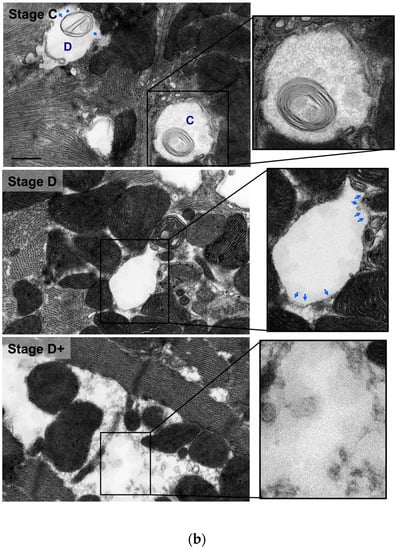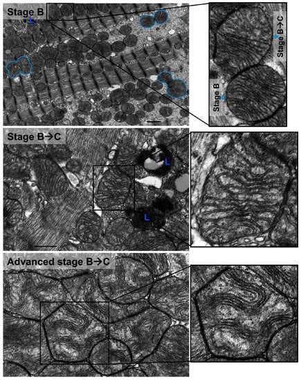Heart failure (HF) is a disease state of heightened oxidative stress [] where ROS and non-ROS induced activation of detrimental signal transduction pathways results in derangement in mitochondrial morphology and function leading to mitochondrial dysfunction and metabolic remodeling as well as altered mitochondrial dynamics, in favor of mitochondrial fission and fragmentation, and decreased mitochondrial biogenesis [,,,]. These aforementioned derangements in mitochondrial integrity and homeostasis play a central role in the pathogenesis of HF and adversely affect myocardial remodeling [,,,,]. Highlighting these signal transduction pathways is out of the scope of the manuscript. The scope of this manuscript is to characterize and define morphologically, utilizing transmission electron microscopy, the progressive stages of mitochondrial vacuolar degeneration. Thus, we present and define for the first time in the literature the progressive stages of mitochondrial vacuolar degeneration in phenylephrine (PE)-stressed cardiac myocytes, in vitro, and in rat models of pressure overload (PO) induced systolic dysfunction as well as in human systolic heart failure; therefore, in conditions of heightened oxidative stress. The characterization of the different stages of mitochondrial vacuolar degeneration is based on our experience and observation from a library of transmission electron microscopy photomicrographs available to us. The identification and classification of the progressive stages of mitochondrial vacuolar degeneration are important in the sense that they will serve as a measure to delineate morphologically, the degree of mitochondrial damage in cells subjected to external apoptotic stimuli, and in disease states in vivo.