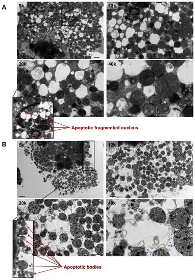 In PE-induced apoptotic cardiac myocytes, numerous mitochondria are observed at an advanced stage of vacuolar degeneration, mainly stage B→C and stages C and D, Figure 3 A,B. Note the presence of an apoptotic-fragmented nucleus, arrows in Figure 3A-zoomed photomicrograph, with evidence of chromatin condensation into a ring-like pattern at the nuclear periphery in one of the fragmented nuclei, arrowhead in Figure 3A-zoomed photomicrograph. Also, note the presence of apoptotic bodies containing numerous mitochondria, arrows in Figure 3B-zoomed photomicrograph. These morphological changes of mitochondrial vacuolar degeneration are seen in isolated cardiac myocytes transfected with an adenovirus encoding for the mitochondrial death and mitophagy marker, BNIP3, and an adenovirus encoding for a constitutively active FOXO3a, which is a transcription factor that has been shown to induce BNIP3 gene expression in cardiac myocytes, Figure 4A and Figure 4B-blue arrows, confirming the presence of the described mitochondrial morphological changes in apoptotic conditions other than PE. The attributed mechanism will be discussed later in the discussion section. Also, note the presence of autophagosomes containing fragmented mitochondria, Figure 4A,B-black arrows. The zoomed photomicrograph in Figure 4A is showing an autophagosome containing fragmented mitochondrion fusing with a lysosome.