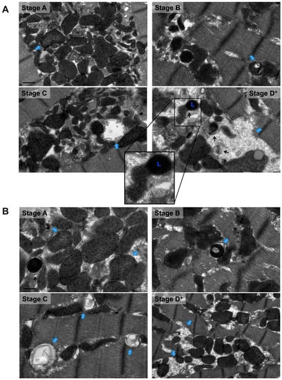 Morphological stages of mitochondrial vacuolar degeneration in a rat model of pressure overload-induced systolic dysfunction. Stage B: there is prominent mitochondrial fission and fragmentation. Blue lines surround mitochondria at early (left middle), intermediate (right lower), and final (right upper) stages of mitochondrial fission. There is focal loss and dissolution of mitochondrial cristae which are now arranged in a horizontal, stacked-up pattern, rather than being dense and folded. Stage B→C: mitochondrial swelling with significant dissolution of mitochondrion cristae at multiple sites. More prominent mitochondrion swelling and dissolution of mitochondrial cristae in advanced stage B→C. The IMM and OMM remain intact. Stage C: Complete dissolution of mitochondrial cristae and IMM. The OMM remains intact. Stage D: Stage C with an associated rupture of OMM (blue arrows pointing at the site of OMM rupture). Stage D+: Area(s) where numerous adjacent mitochondria had undergone complete vacuolar degeneration and entire dissolution of mitochondrial cristae, IMM and OMM. L: lysosomes. Photomicrographs are 40k x magnified, scale bar 0.5 μm. In stage B, photomicrograph is 12k × magnified, scale bar 1 μm.