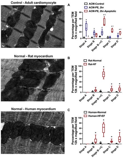 Representative normal transmission electron photomicrographs and quantification of the different stages of mitochondrial vacuolar degeneration in: A. Phenylephrine (PE)-stressed adult cardiac myocytes (ACMs). * p < 0.05 vs. ACM-Control and † p < 0.05 vs. ACM-PE, 2. B. Animal (rat) model of pressure overload-induced HF, and C. Human HF with reduced ejection fraction (HFrEF). * p < 0.05 vs. Normal. Data are presented as box and whisker plots (lines showing median, 25th and 75th percentiles with whiskers showing minimum and maximum values.