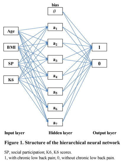 Variables: For this study, there were two dependent variables for CLBP, i.e., absence (0, experienced) and presence (1, not experienced). In order to carry out the comparison with the logistic regression analysis, the number of independent variables was set to four. There were 10 possible candidates for the independent variables which included gender [12], age [13], spouse (presence or none), BMI (kg/m2) [14], chronic stiff shoulder (presence or none), social participation (presence or none) [15,16,17], sleeping time (hours/day), the K6 scores [18,19,20], a rate of 1.5 METs or less [21], and number of steps (steps/day). The relationship among these ten independent variables, in a conventional study, and the dependent variables was discussed, and the four variables with high correlation were taken as the independent variables. Therefore, the four independent variables selected were age, body mass index (BMI), social participation and the K6 score.