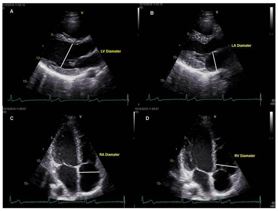 Measurements obtained from echocardiography views. (A): Parasternal long-axis left ventricular diastolic diameter, (B): parasternal long-axis left atrium diameter, (C): right atrial diameter from apical four-chamber view, (D): right ventricular diameter from apical four-chamber view.