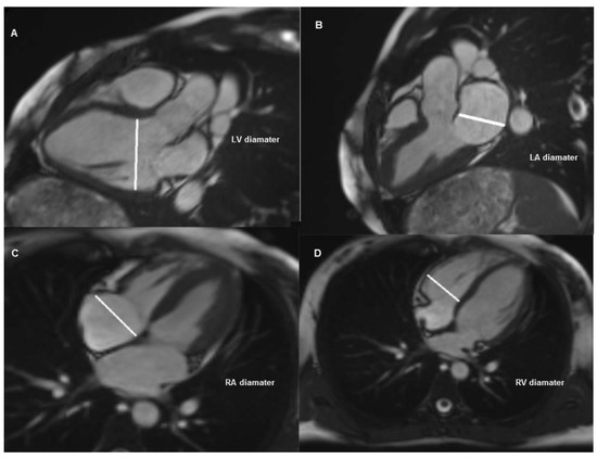 Measurements from cardiac magnetic resonance imaging. (A): Left ventricular diastolic diameter from three-chamber view, (B): left atrial diameter from three-chamber view, (C): right atrial diameter from four-chamber view, (D): right ventricular diameter from four-chamber view.