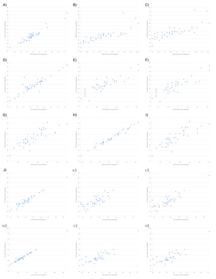 Scatter plots between CMR and TTE measurements. (A) LVED measures between R1 and R2. (B) LVED measures between R1 and C. (C) LVED measures between R2 and C. (D) LVES measures between R1 and R2. (E) LVES measures between R1 and C. (F) LVES measures between R2 and C. (G) LAAP measures between R1 and R2. (H) LAAP measures between R1 and C. (I) LAAP measures between R2 and C. (J) RV measures between R1 and R2. (K) RV measures between R1 and C. (L) RV measures between R2 and C. (M) RA measures between R1 and R2. (N) RA measures between R1 and C. (O) RA measures between R2 and C.