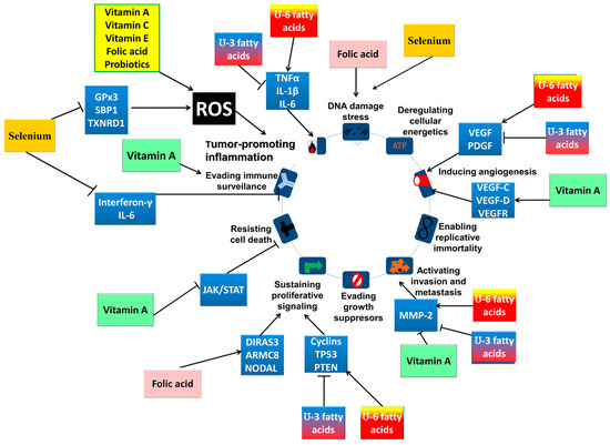 To determine the influence of nutrients on cancer, they can be cross-linked with the hallmarks of cancer through their molecular intermediaries. The most affected cancer hallmark is tumor-promoted inflammation through oxidative stress caused by reactive oxygen species [52]. The most relevant data are summarized in Table 2 and Figure 1.