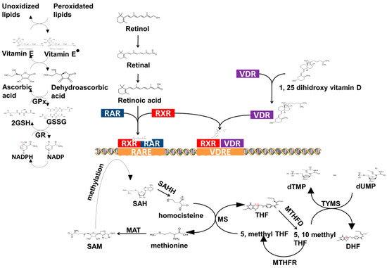 Pathways or interactions representative of the metabolism of nutrients. The majority of the nutrients function either as electron transporters in redox systems or as ligands for transcription factors involved in gene regulation. These effects can be intertwined, as in the case of folate metabolism. Folate metabolism has a dual effect in that it facilitates protein methylation by providing 1-carbon source influencing gene regulation, and it acts in the redox system of oxidative stress by influencing the levels of homocysteine. GPx = glutathione peroxidase; GSH = reduced glutathione; GSSG = oxidized glutathione; GR = gluthatione reductase; NADP = nicotinamide dinucleotide phosphate; RAR = retinoic acid receptor; RXR = retinoid X receptor; RARE = retinoic acid response element; VDR = vitamin D receptor; VDRE = vitamin D response element; dUMP = deoxy uridine monophosphate; dTMP = deoxythymidine monophosphate; TYMS = thymidilatesynthetase; DHF = dihydrofolate; T/HF = tetrahydrofolate; MTHFR = methylene tetrahydrofolate reductase; MTHFD = methylene tetrahydrofolate dehydrogenase; MS = methionine synthetase; SAM = S-adenosyl methionine; SAH = S-adenosine homocysteine; MAT = methionine adenosine transferase; SAHH = S-adenylhomocisteine hydrolase.