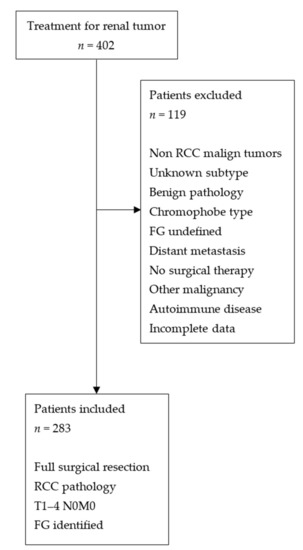 Flow chart of patients who met study inclusion/exclusion criteria. RCC = renal cell carcinoma, FG = Fuhrman grade.