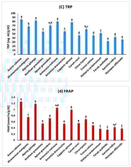 The characteristics of antioxidant potentials of methanol extracts of 15 spices. The different letters in normal bars represent the significant variations at p < 0.05 by using Tukey′s method. (a) DPPH (%), (b) ABTS (mmol Trolox equiv/g dry mass) (c) TRP (mg of ascorbic acid equiv/g dry mass), and (d) FRAP (mmol Fe/g dry mass).