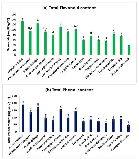 (a) Total flavonoid and (b) total polyphenol content of methanolic extracts of 15 spices. The different letters in normal bars represent the significant variations at p < 0.05 by using Tukey′s method The quantity of flavonoid is articulated as mg of rutin equiv/g dry mass. The quantity of polyphenol is articulated as mg of gallic acid equiv/g dry extract.