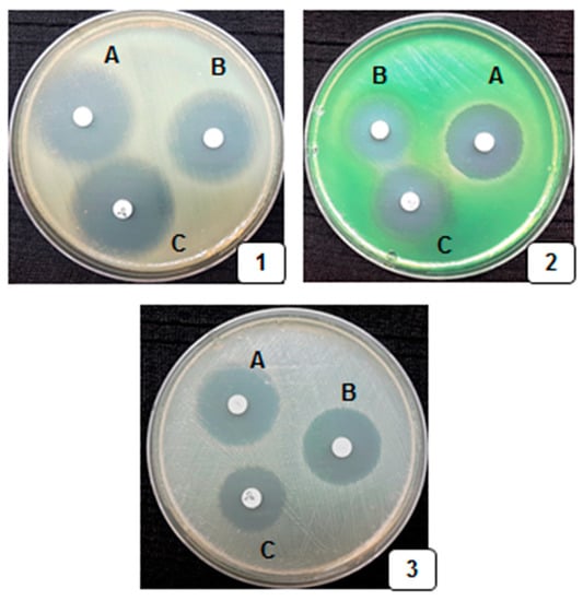 The quality control study of standard antibiotic discs by disc well diffusion method with corresponding zone of inhibitions: A: Norfloxacin (10 µg); B: Gentamicin (10 µg); and C: Ciprofloxacin (5 µg) with ATCC strains: (1) E. coli-25922; (2) P. aeruginosa-27853; and (3) S. aureus-25923