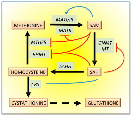 The methionine cycle is under the control of several regulatory mechanisms. Various enzymes, including MATI/III, cystathionine synthetase (CBS), betaine homocysteine methyltransferase (BHMT) and glycine N-methyltransferase (GNMT), contribute to the maintenance of sufficient homocysteine concentrations. SAM and SAH “long-range” interactions [12] induce CBS activation (Figure 2). SAM decreases homocysteine re-methylation to methionine by allosterically inhibiting BHMT and methyltetrahydrofolate reductase (MTHFR), and the latter is also inhibited by SAH [16,17,18]. Thus, high SAM levels inhibit MTHFR and stimulate reduced glutathione (GSH) synthesis (Figure 2). Furthermore, methylation reactions are regulated by the SAH inhibitory effect on MT and GNMT [19]. Nevertheless, the reduction of the glycine remethylation could result in a certain decrease of the folate cycle. GNMT is controlled post-transcriptionally by phosphorylation [12] and is subjected to allosteric inhibition by MTHF [13,20,21,22].