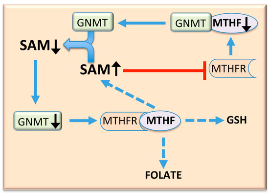 The GNMT salvage pathway. GNMT binds to and may be inhibited by MTHF. Therefore, when SAM levels increase, MeTHFR inhibition leads to a decrease in free MTHF and dissociation of the complex GNMT–MTHF. The consequent rise in free GNMT prevents the increase of SAM level. The decrease of SAM concentration is associated with a fall in free GNMT and with a release of MTHFR inhibition, leading to a rise in MTHF availability. The latter may be used for SAM resynthesis, GSH synthesis, and a rise in folate content. The blue arrows indicate activation; the red blunt arrows indicate inhibition; the black arrows indicate increase/decrease.